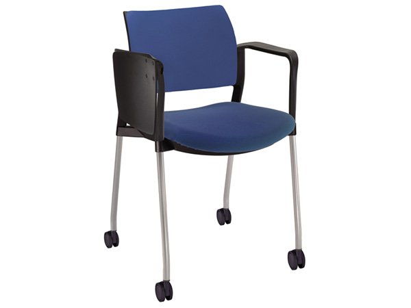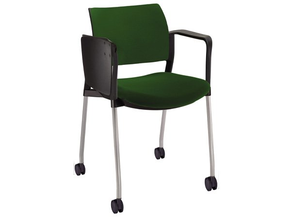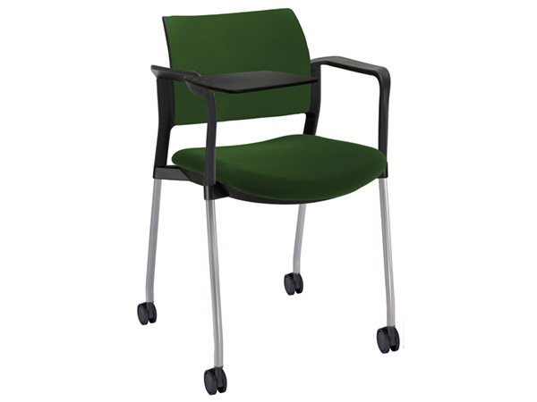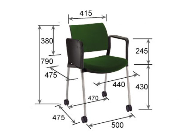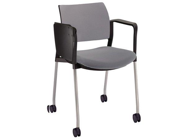 - Estructura: de acero tubular de 7/8″ de diámetro, calibre 14; con acabado en pintura epóxica (electrstática) color negro mate o gris, con rodajas giratorias tipo dual en color negro, con descansabrazos de polipropileno en color negro y con paleta lateral abatible en color negro fijada al brazo mediante un dispositivo.